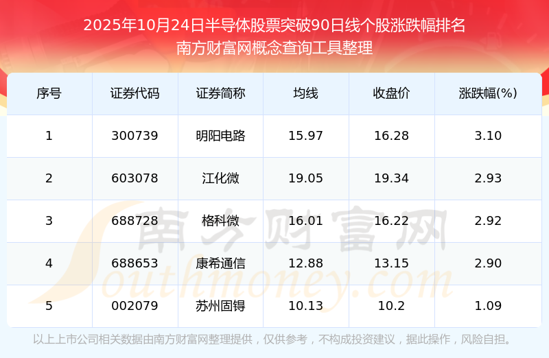 根據(jù)南方財富網(wǎng)概念查詢工具數(shù)據(jù)統(tǒng)計,截止2025年10月24日收盤,半導體股票共有5只個股收盤價向上突破了90日線。其中漲幅較大的個股有明陽電路、江化微、格科微等,漲幅分別為3.10%、2.93%、2.92%。