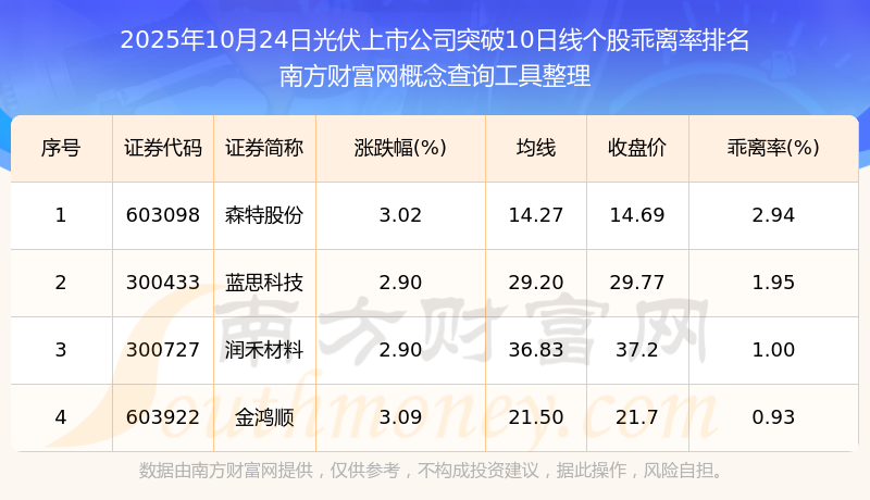 2025年10月24日光伏上市公司突破10日線個股乖離率排名