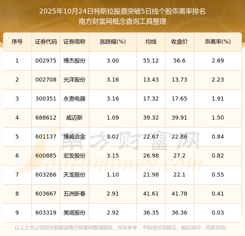2025年10月24日特斯拉股票突破5日線(xiàn)個(gè)股乖離率排名