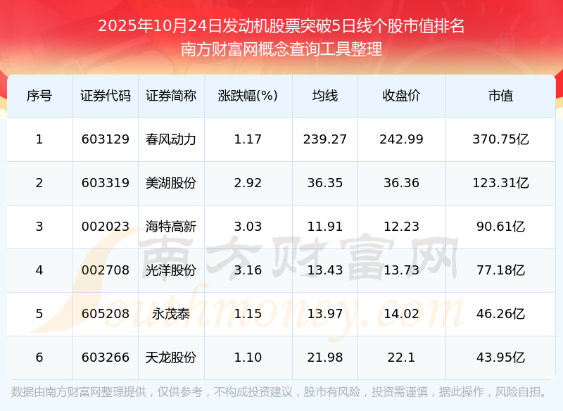 2025年10月24日發(fā)動(dòng)機(jī)股票突破5日線個(gè)股市值排名