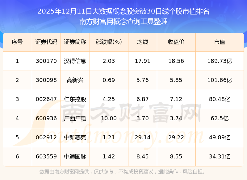 2025年12月11日大數(shù)據(jù)概念股突破30日線個(gè)股市值排名