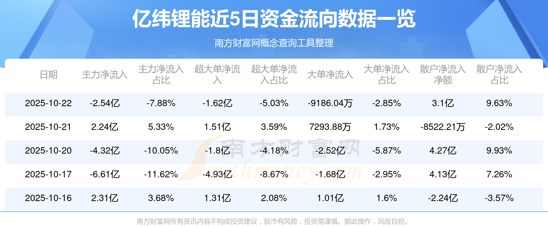 10月22日消息,億緯鋰能主力凈流出2.54億元,超大單凈流出1.62億元,散戶凈流入3.1億元。