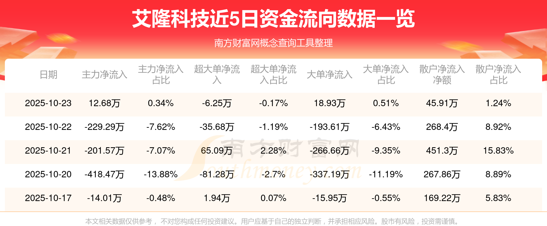 10月23日消息,艾隆科技主力資金凈流入12.68萬(wàn)元,超大單資金凈流出6.25萬(wàn)元,散戶資金凈流入45.91萬(wàn)元。