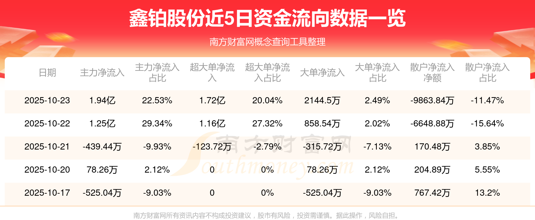 10月23日消息,鑫鉑股份資金凈流入1.94億元,超大單資金凈流入1.72億元,換手率27.48%,成交金額8.6億元。