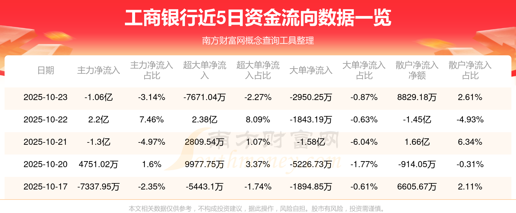 10月23日消息,工商銀行主力資金凈流出1.06億元,超大單資金凈流出7671.04萬元,散戶資金凈流入8829.18萬元。