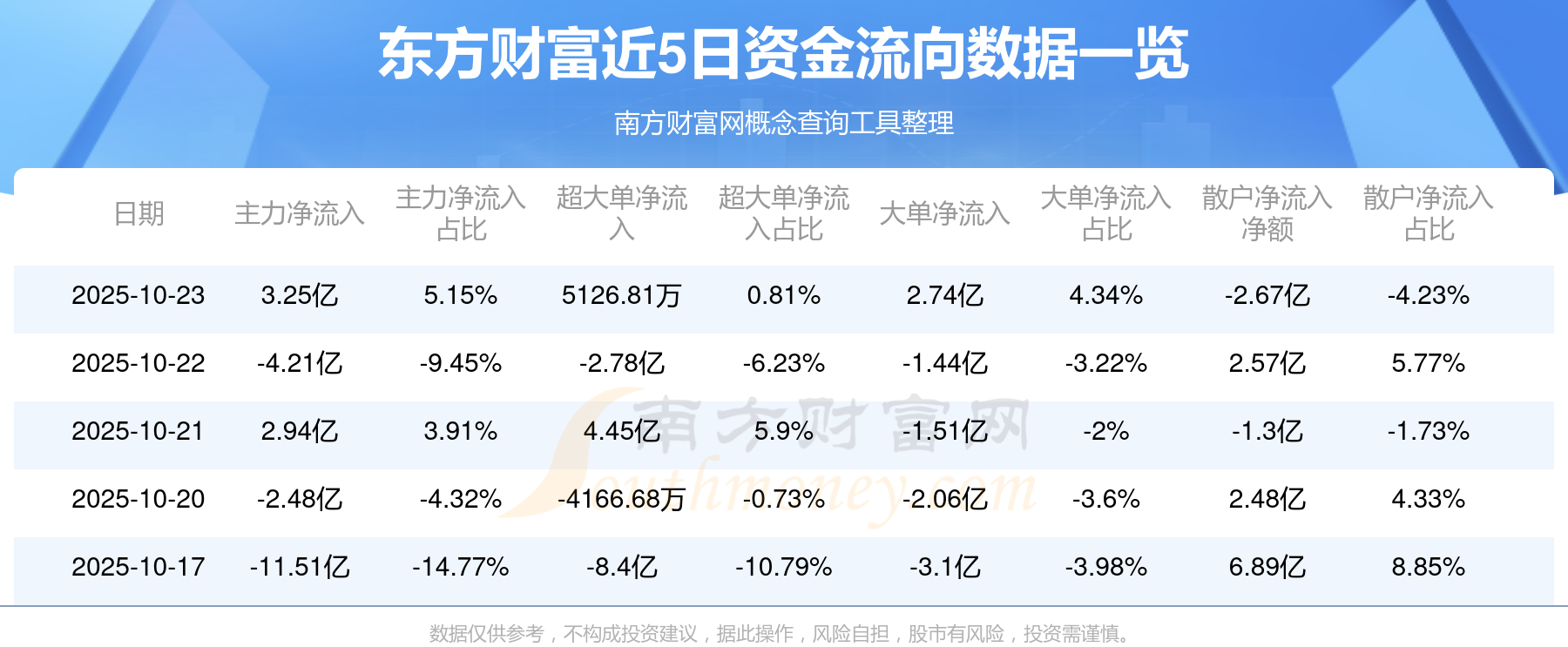 10月23日消息,東方財(cái)富主力凈流入3.25億元,超大單凈流入5126.81萬元,散戶凈流出2.67億元。