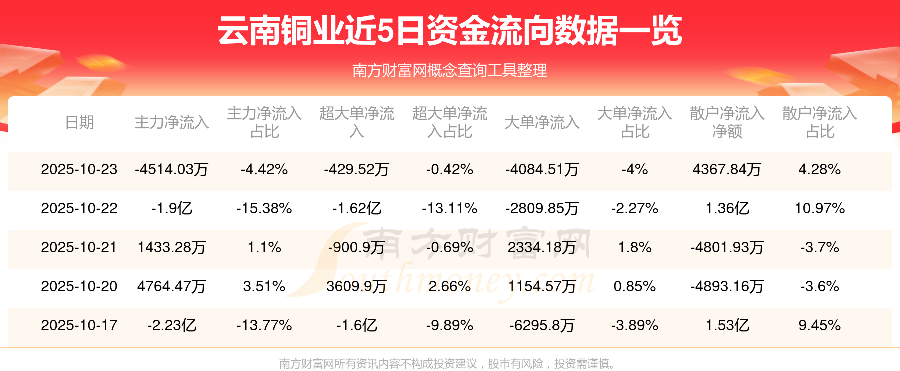 10月23日消息,云南銅業(yè)主力凈流出4514.03萬元,超大單凈流出429.52萬元,散戶凈流入4367.84萬元。