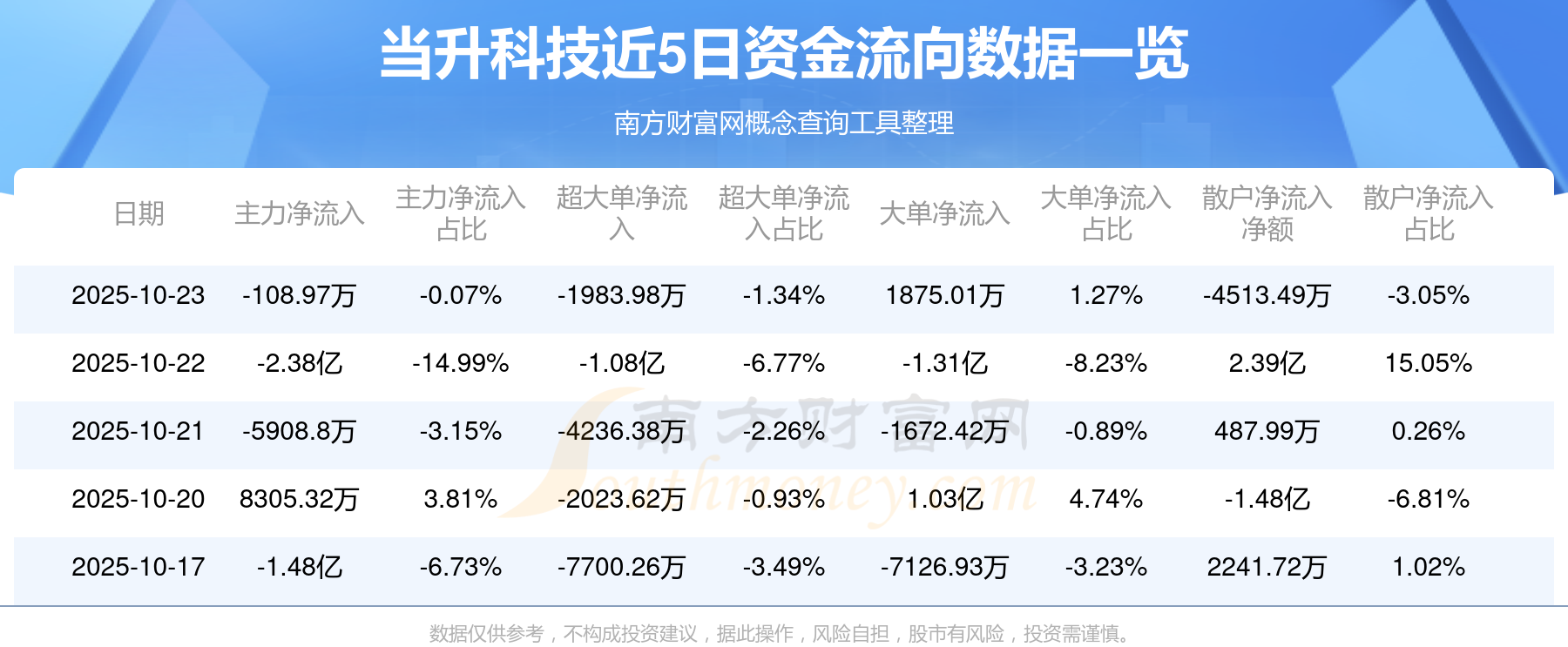 10月23日消息,當(dāng)升科技10月23日主力凈流出108.97萬(wàn)元,超大單凈流出1983.98萬(wàn)元,大單凈流入1875.01萬(wàn)元,散戶凈流出4513.49萬(wàn)元。