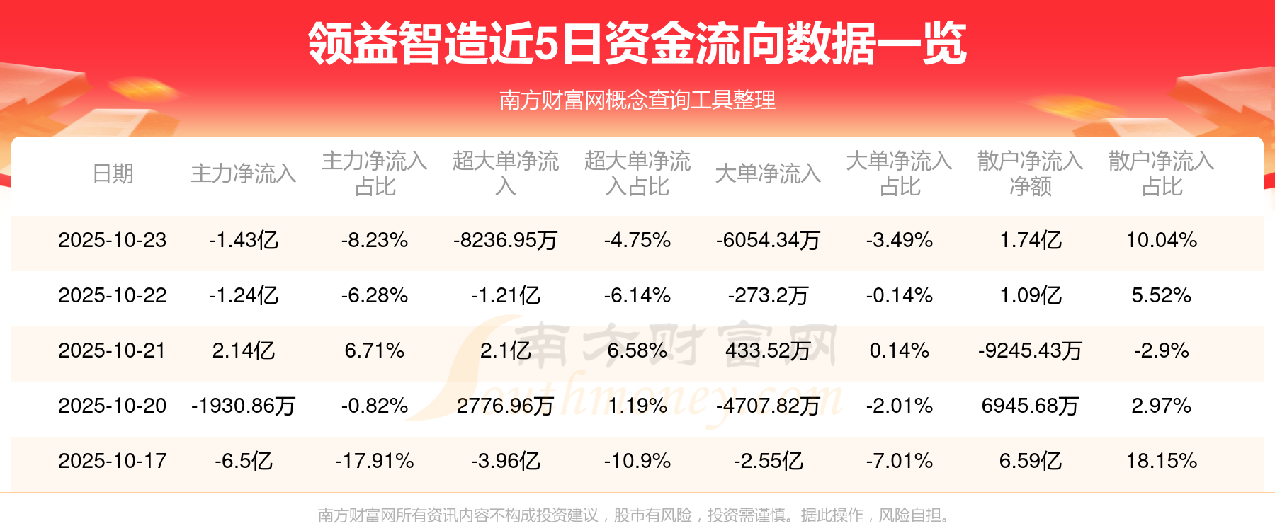 10月23日消息,領(lǐng)益智造資金凈流出1.43億元,超大單凈流出8236.95萬元,換手率1.67%,成交金額17.36億元。