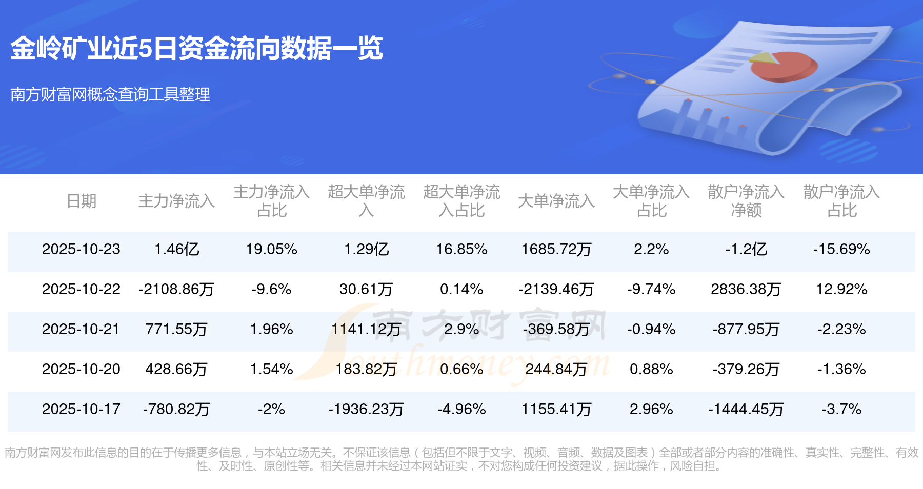 10月23日消息,金嶺礦業(yè)主力資金凈流入1.46億元,超大單資金凈流入1.29億元,散戶資金凈流出1.2億元。