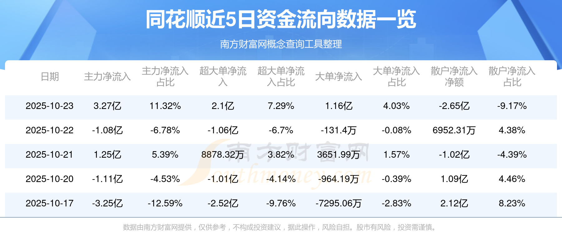 10月23日消息,同花順10月23日主力資金凈流入3.27億元,超大單資金凈流入2.1億元,大單資金凈流入1.16億元,散戶資金凈流出2.65億元。