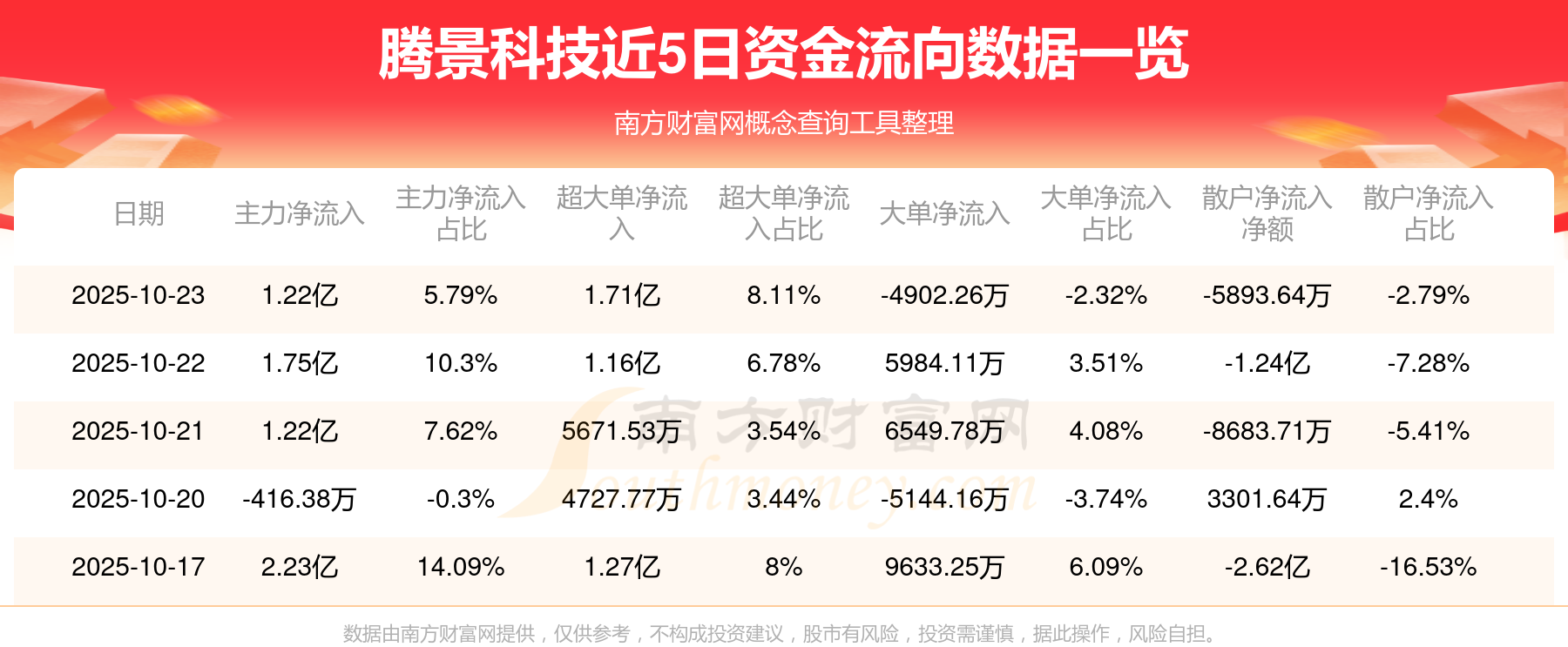 資金流向數(shù)據(jù)方面,10月23日主力資金凈流流入1.22億元,超大單資金凈流入1.71億元,大單資金凈流出4902.26萬元,散戶資金凈流出5893.64萬元。