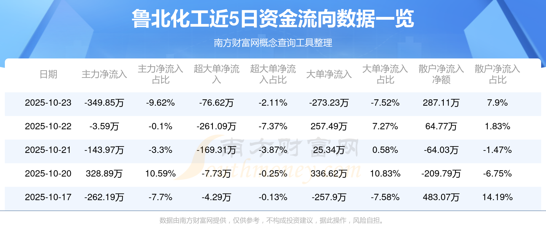 10月23日消息,魯北化工資金凈流出349.85萬(wàn)元,超大單資金凈流出76.62萬(wàn)元,換手率0.91%,成交金額3635.1萬(wàn)元。