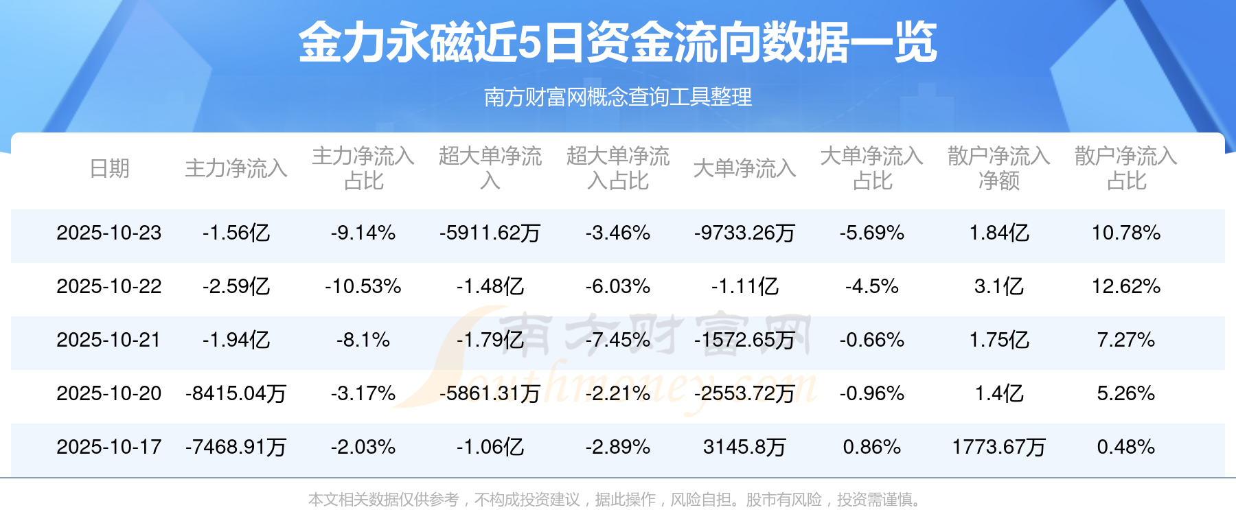 10月23日消息,金力永磁主力資金凈流出1.56億元,超大單資金凈流出5911.62萬元,散戶資金凈流入1.84億元。