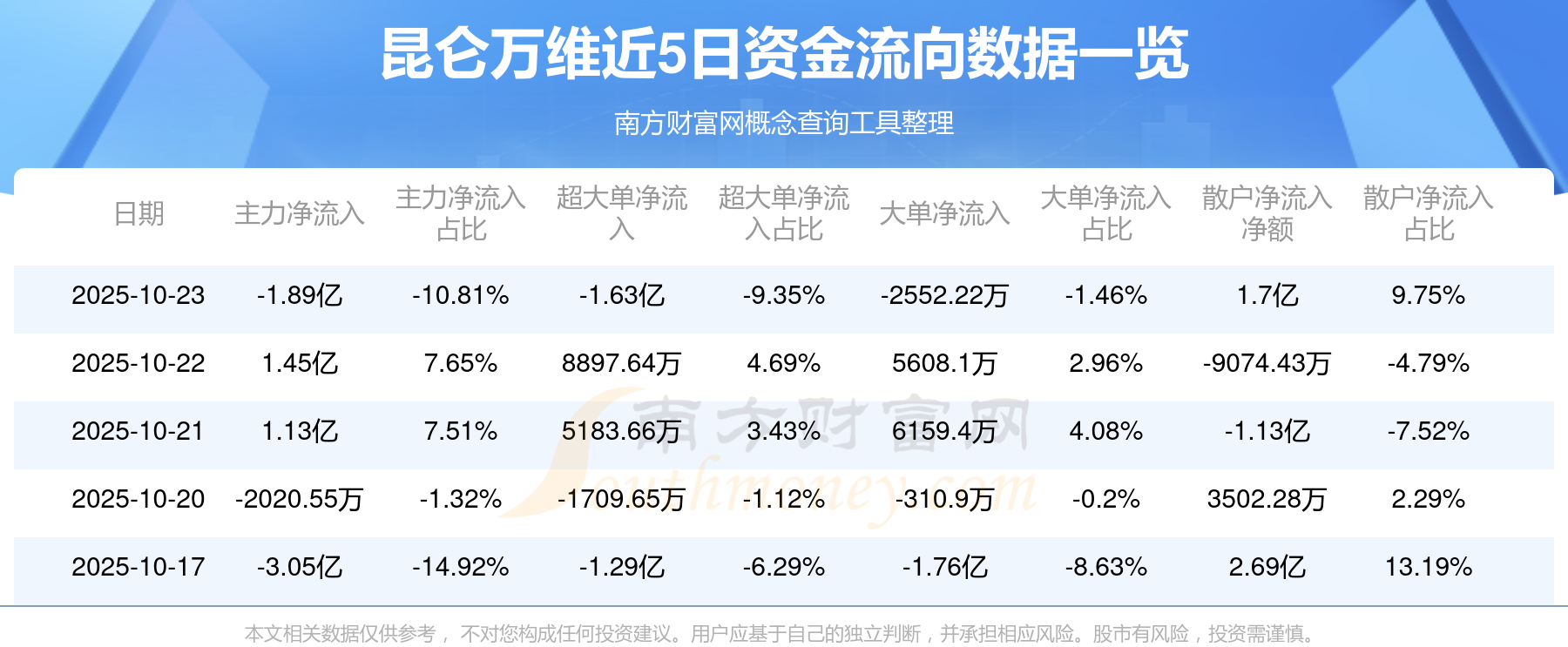 10月23日消息,昆侖萬(wàn)維10月23日主力資金凈流出1.89億元,超大單資金凈流出1.63億元,大單資金凈流出2552.22萬(wàn)元,散戶資金凈流入1.7億元。