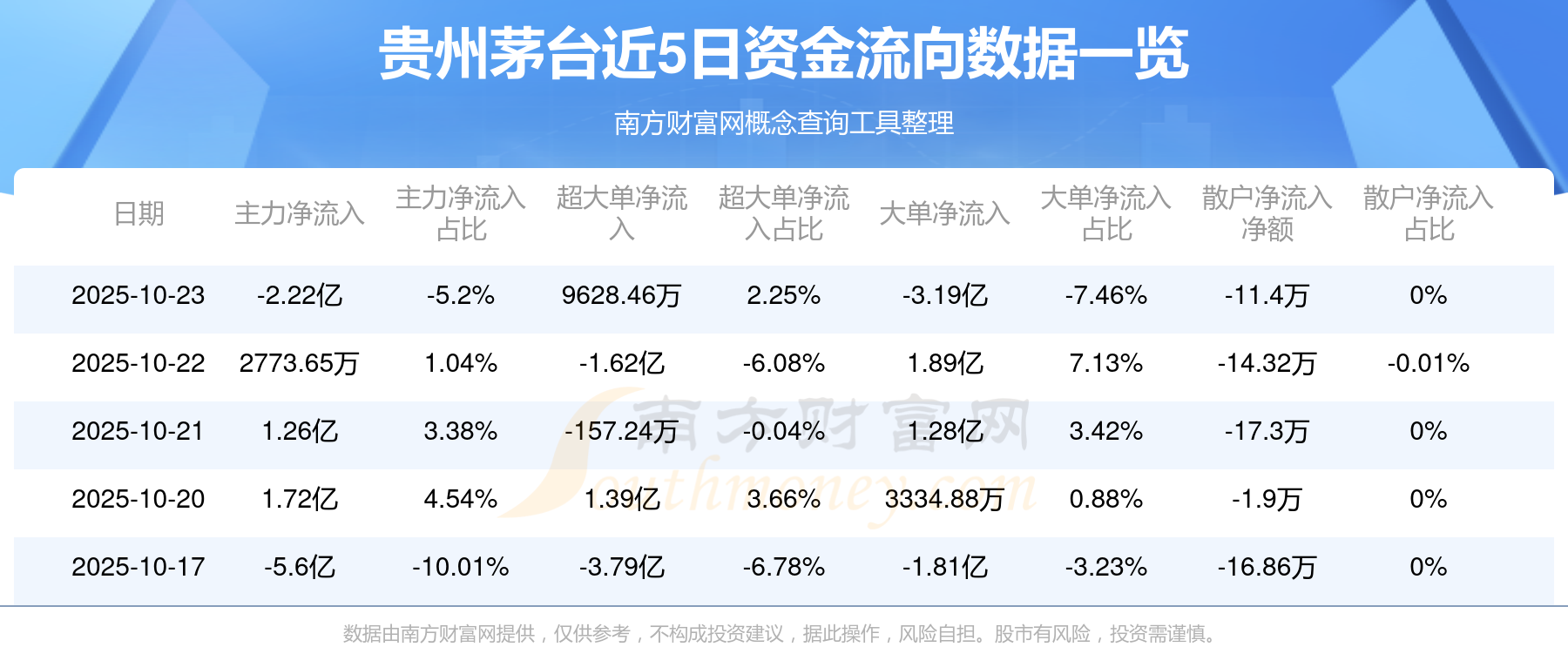 10月23日消息,貴州茅臺10月23日主力凈流出2.22億元,超大單凈流入9628.46萬元,大單凈流出3.19億元,散戶凈流出11.4萬元。