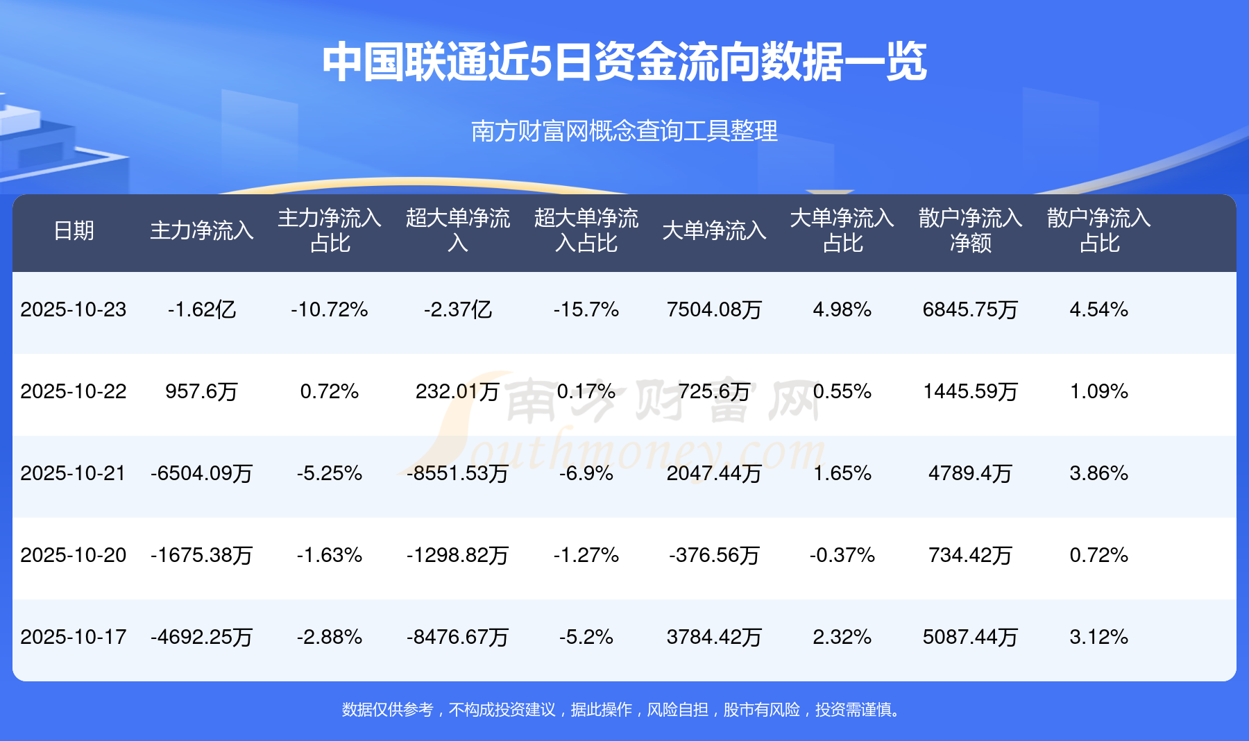 10月23日消息,中國(guó)聯(lián)通10月23日主力資金凈流出1.62億元,超大單資金凈流出2.37億元,大單資金凈流入7504.08萬元,散戶資金凈流入6845.75萬元。