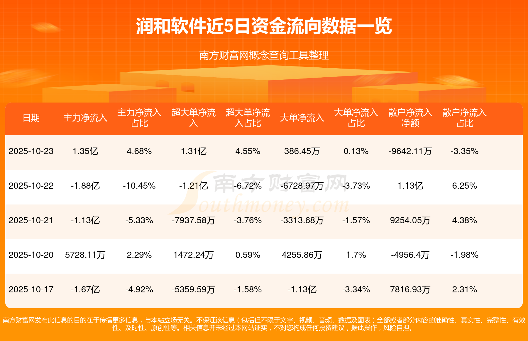 10月23日消息,潤和軟件10月23日主力凈流入1.35億元,超大單凈流入1.31億元,大單凈流入386.45萬元,散戶凈流出9642.11萬元。