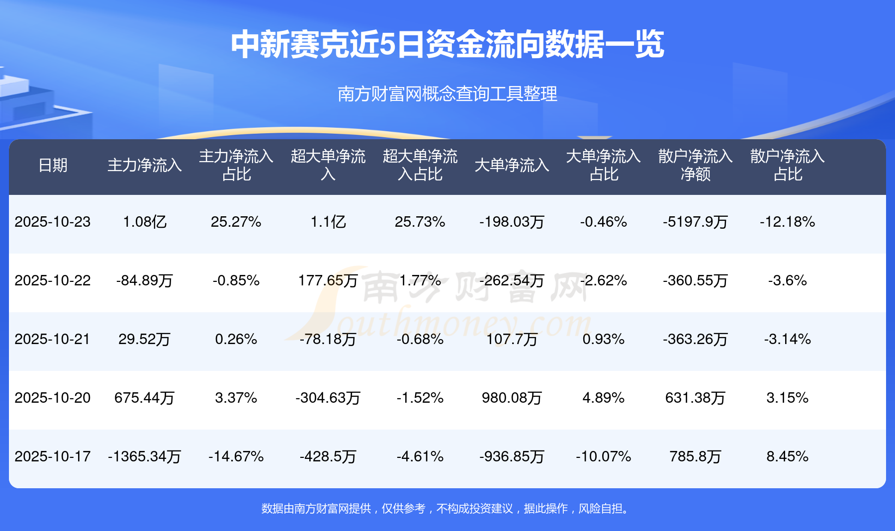 10月23日消息,中新賽克10月23日主力凈流入1.08億元,超大單凈流入1.1億元,大單凈流出198.03萬元,散戶凈流出5197.9萬元。