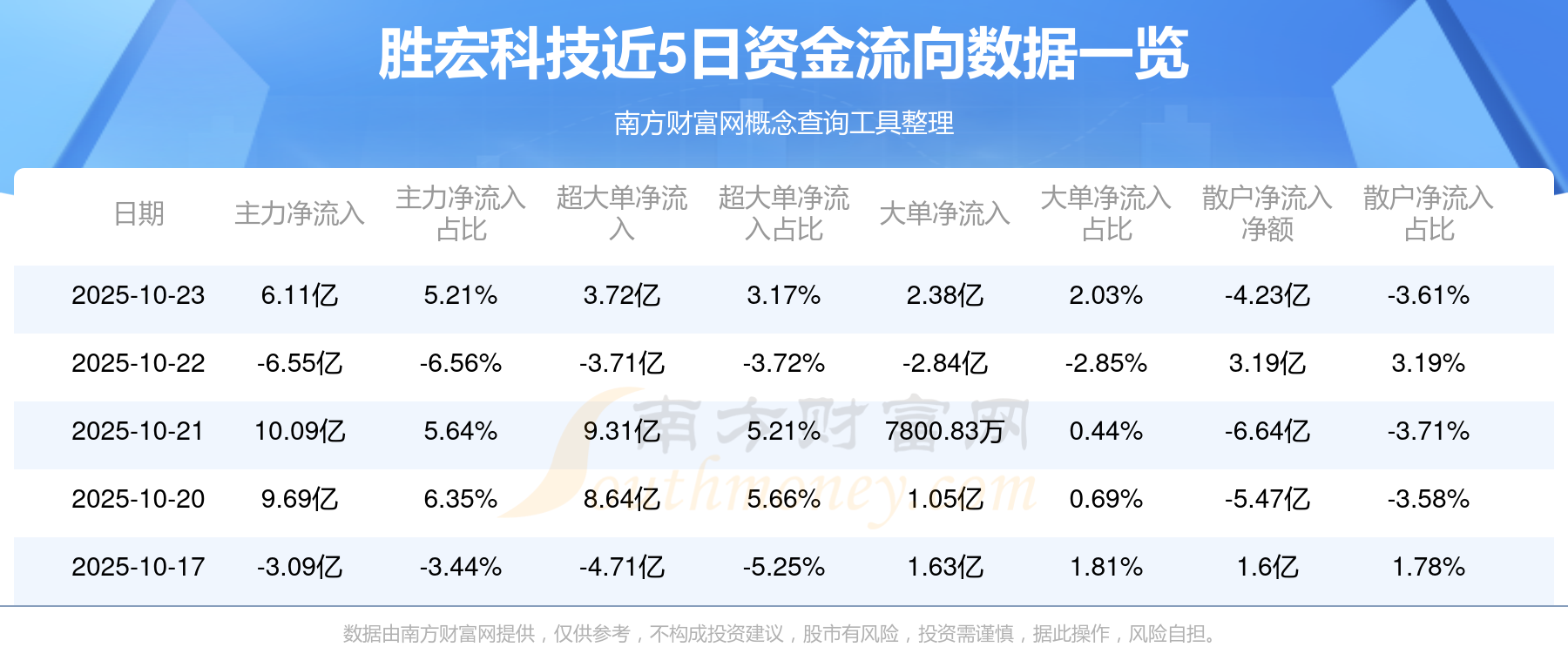 10月23日消息,勝宏科技10月23日主力凈流入6.11億元,超大單凈流入3.72億元,大單凈流入2.38億元,散戶凈流出4.23億元。