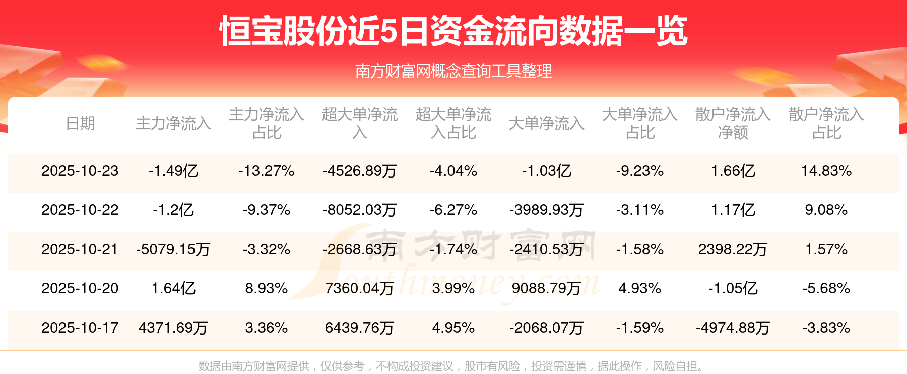 10月23日消息,恒寶股份10月23日主力凈流出1.49億元,超大單凈流出4526.89萬元,大單凈流出1.03億元,散戶凈流入1.66億元。