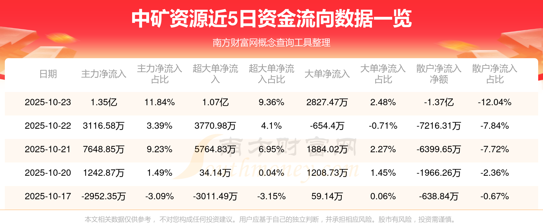 10月23日消息,中礦資源資金凈流入1.35億元,超大單資金凈流入1.07億元,換手率1.96%,成交金額7.37億元。