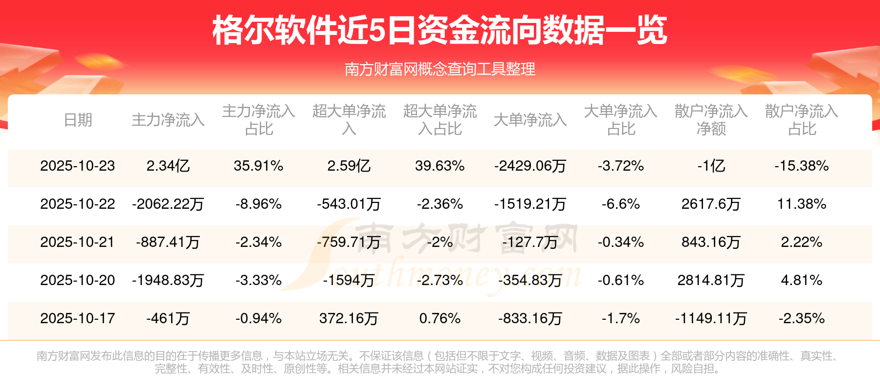 資金流向數(shù)據(jù)方面,10月23日主力資金凈流流入2.34億元,超大單資金凈流入2.59億元,大單資金凈流出2429.06萬元,散戶資金凈流出1億元。