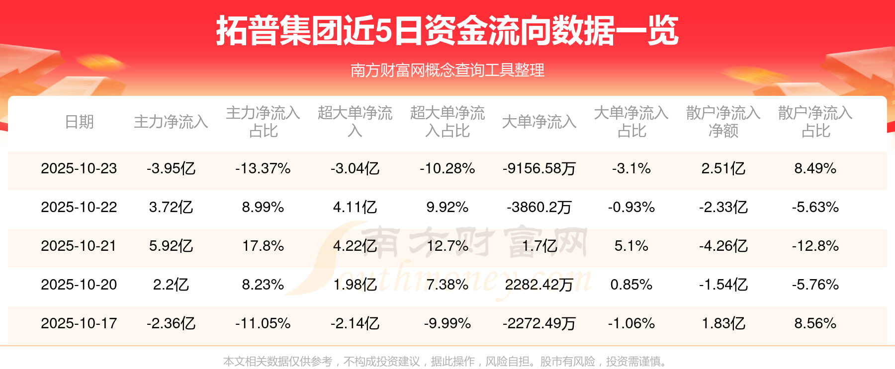 10月23日消息,拓普集團主力資金凈流出3.95億元,超大單資金凈流出3.04億元,散戶資金凈流入2.51億元。