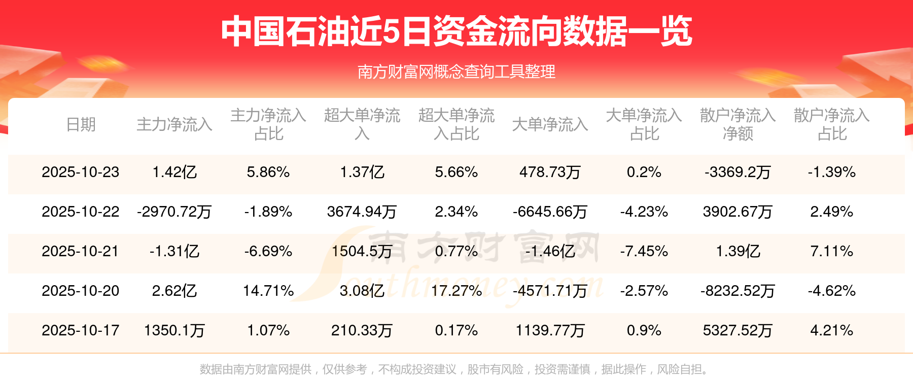 10月23日消息,中國石油10月23日主力凈流入1.42億元,超大單凈流入1.37億元,大單凈流入478.73萬元,散戶凈流出3369.2萬元。