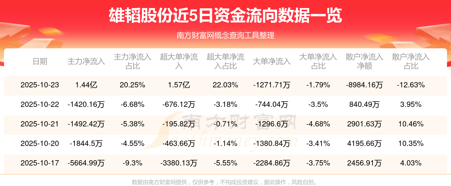 10月23日該股主力凈入1.44億元,其中資金流入方面:超大單凈入1.96億元,大單凈入1.43億元,中單凈入1.75億元,散戶凈入1.95億元;資金流出方面:超大單凈出3894.58萬元,大單凈出1.55億元,中單凈出2.29億元,散戶凈出2.84億元。