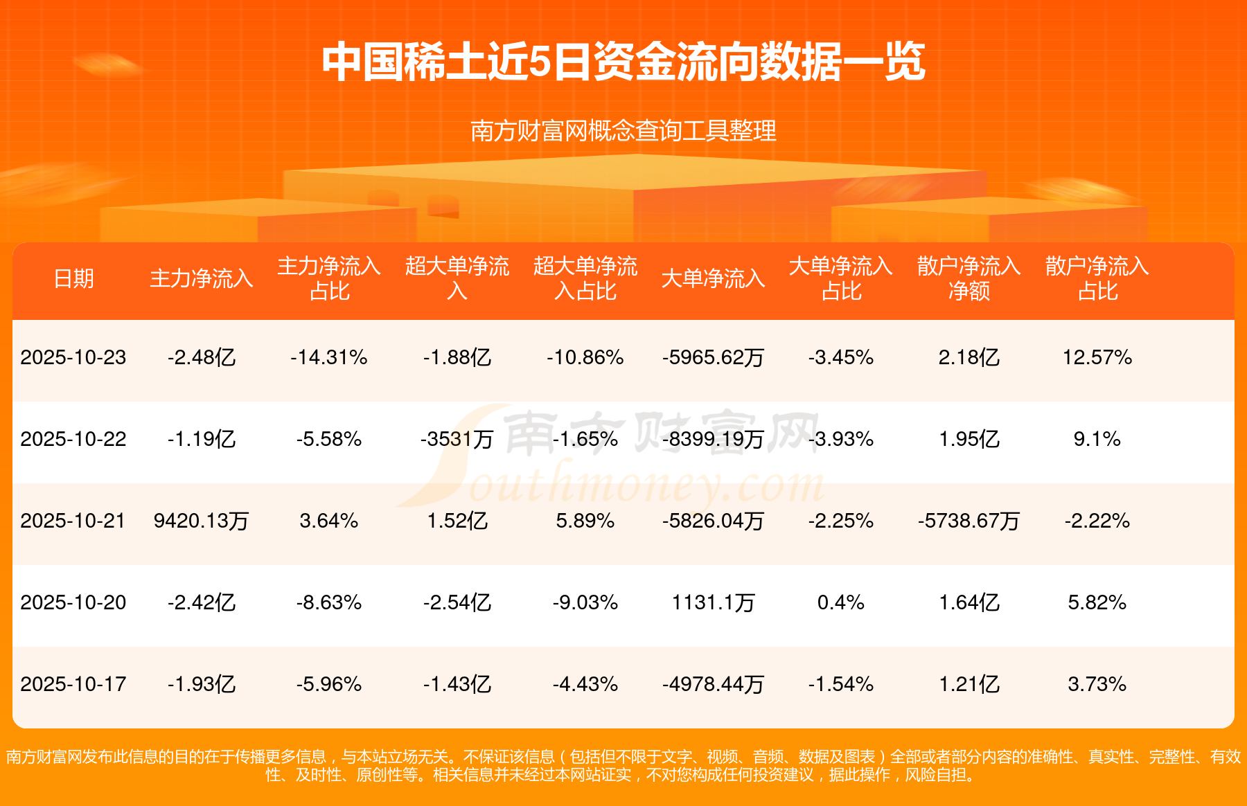 10月23日消息,中國(guó)稀土10月23日主力凈流出2.48億元,超大單凈流出1.88億元,大單凈流出5965.62萬(wàn)元,散戶凈流入2.18億元。