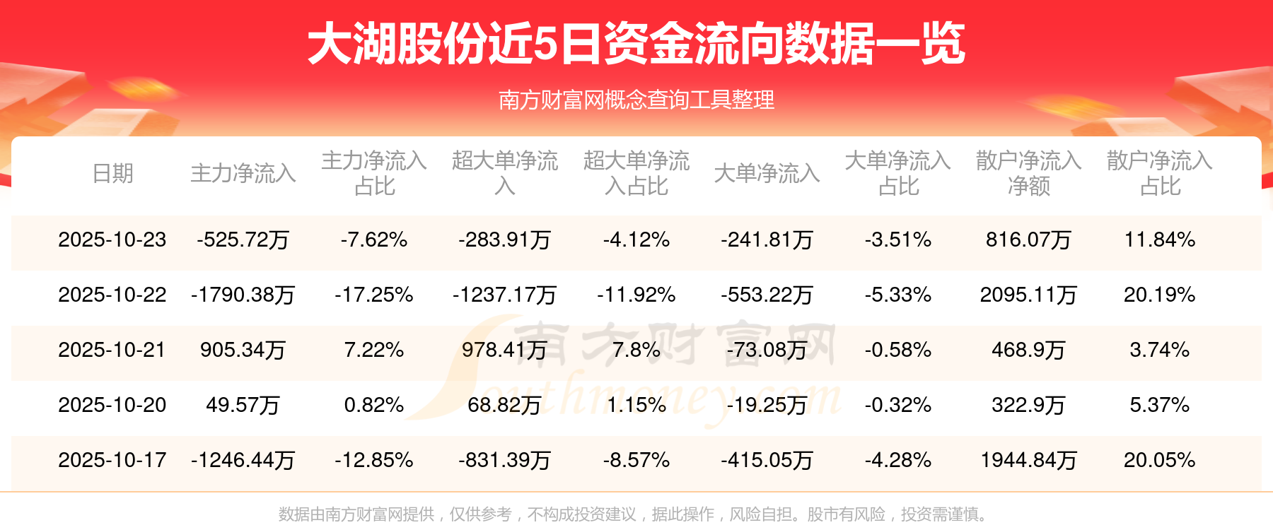 10月23日消息,大湖股份10月23日主力資金凈流出525.72萬元,超大單資金凈流出283.91萬元,大單資金凈流出241.81萬元,散戶資金凈流入816.07萬元。
