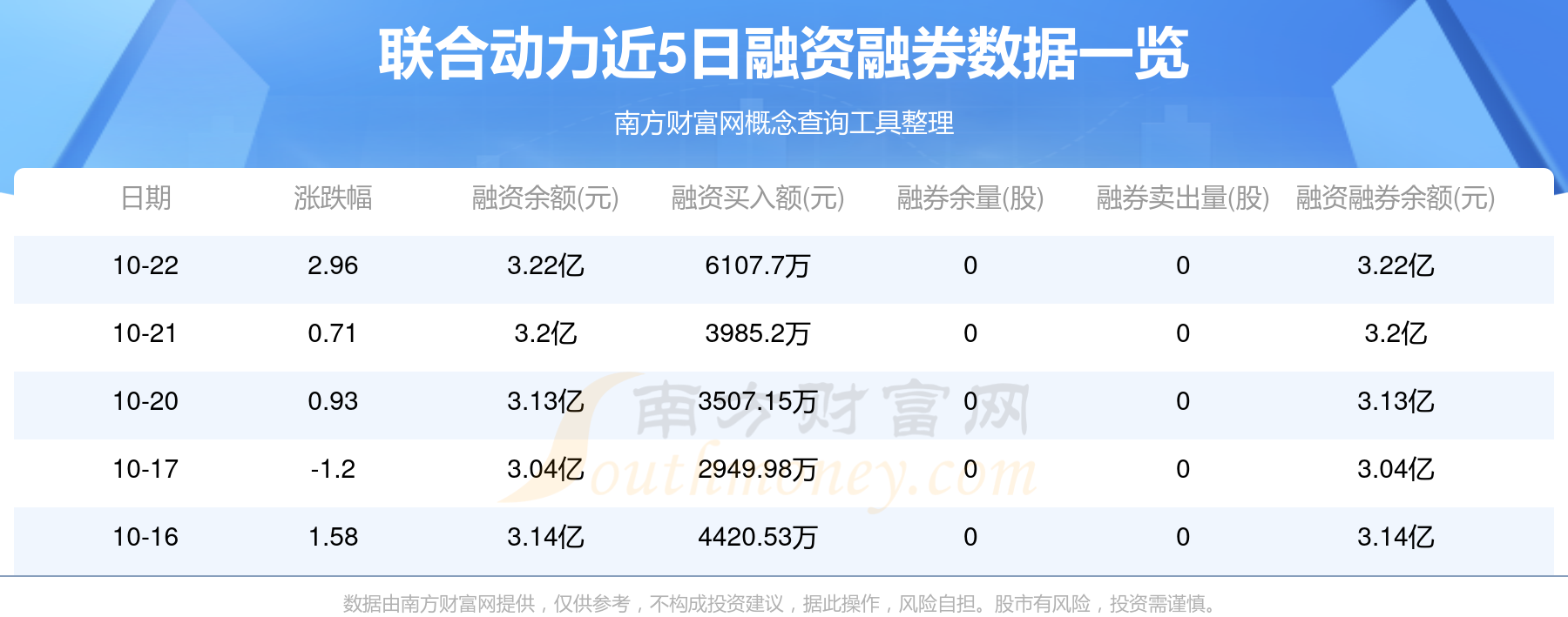 聯(lián)合動力10月22日融券信息顯示,融資方面,當(dāng)日融資買入6107.7萬元,融資償還5951.93萬元,融資凈買額155.77萬元。近5日融資融券數(shù)據(jù)一覽見下表: