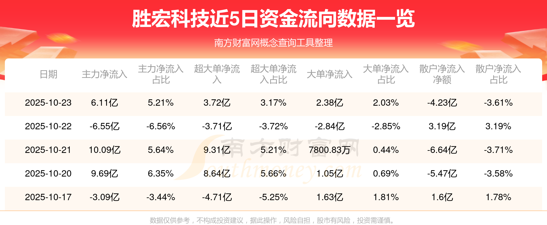 10月23日消息,勝宏科技資金凈流入6.11億元,超大單資金凈流入3.72億元,換手率5.52%,成交金額140.79億元。
