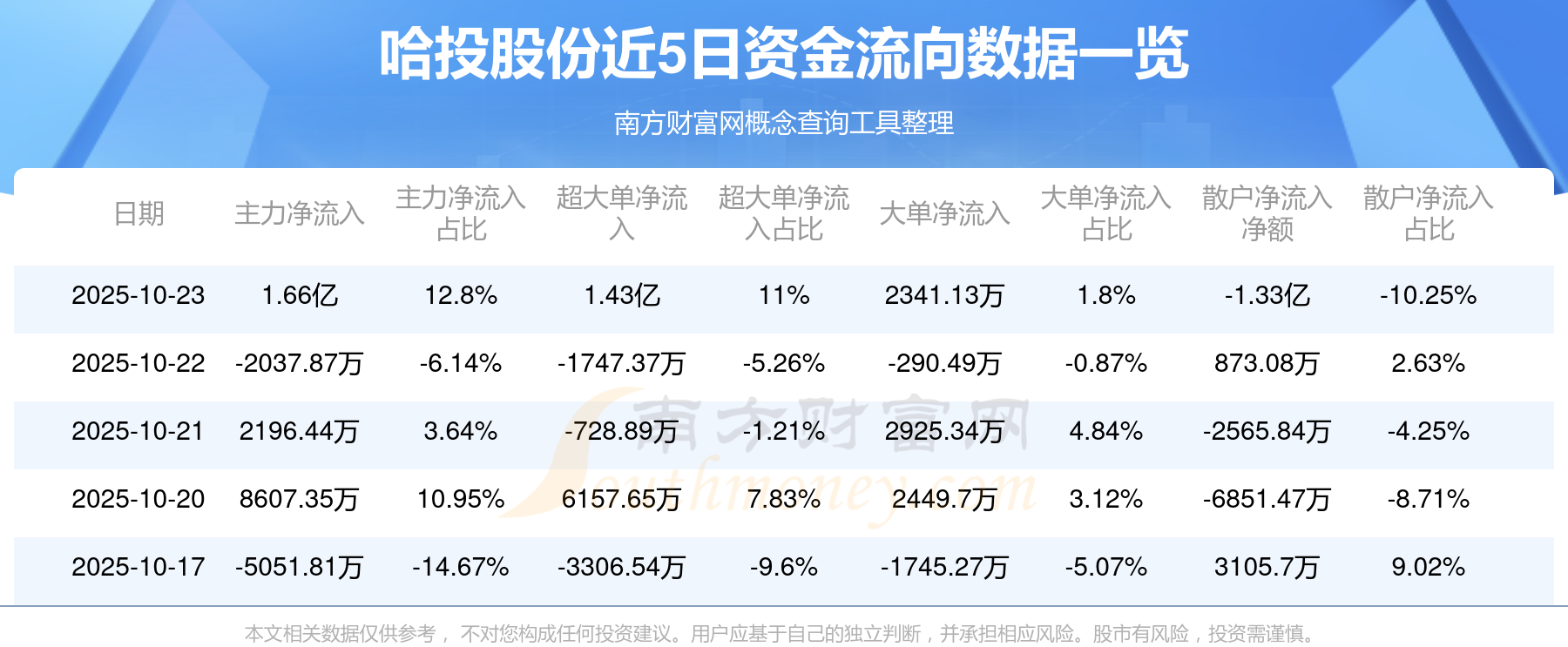 10月23日消息,哈投股份主力凈流入1.66億元,超大單凈流入1.43億元,散戶凈流出1.33億元。