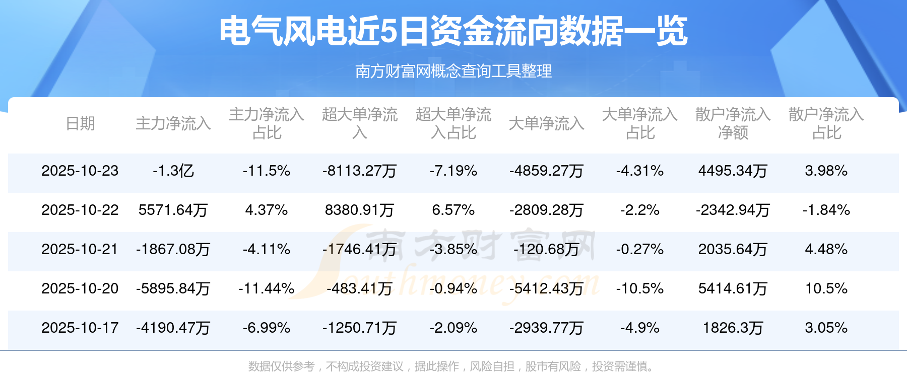 10月23日消息,電氣風電主力資金凈流出1.3億元,超大單資金凈流出8113.27萬元,散戶資金凈流入4495.34萬元。