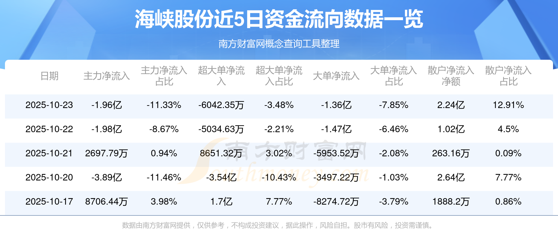 10月23日消息,海峽股份10月23日主力資金凈流出1.96億元,超大單資金凈流出6042.35萬元,大單資金凈流出1.36億元,散戶資金凈流入2.24億元。