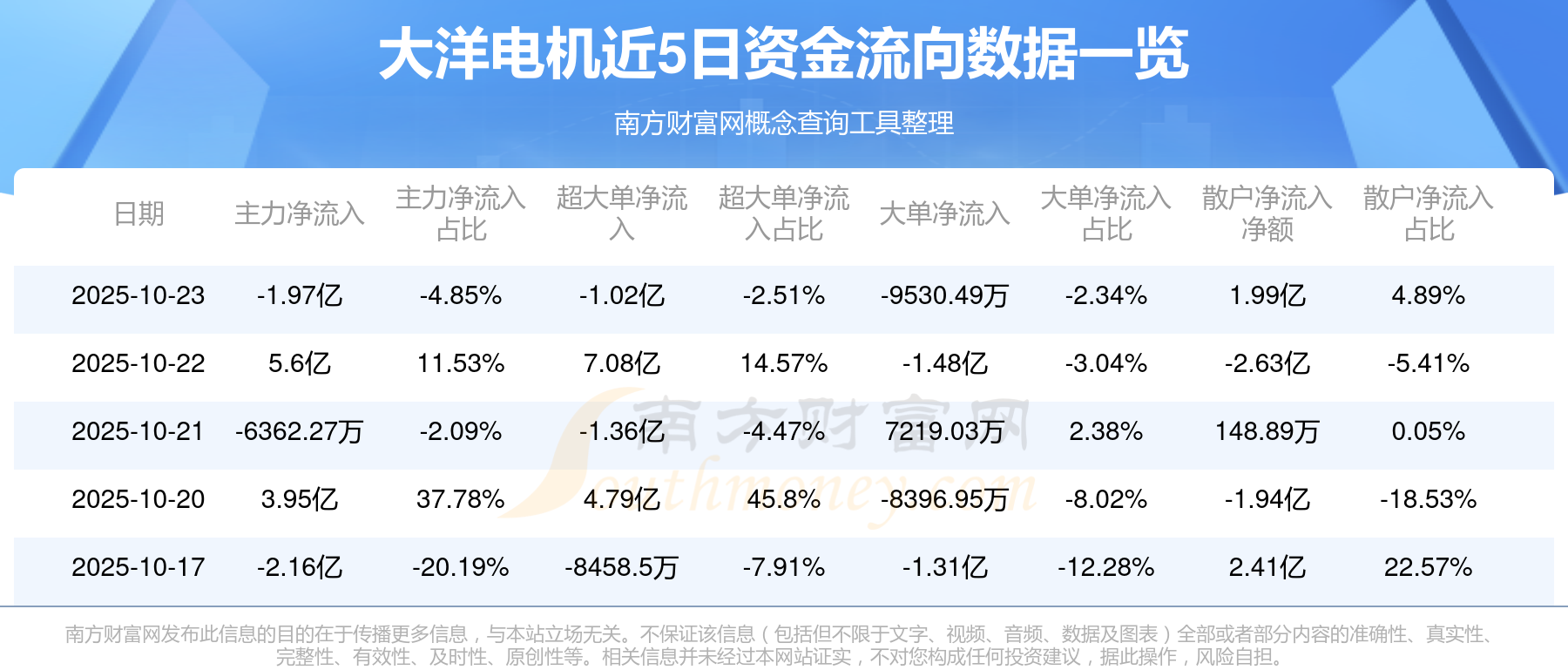 10月23日消息,大洋電機10月23日主力凈流出1.97億元,超大單凈流出1.02億元,大單凈流出9530.49萬元,散戶凈流入1.99億元。