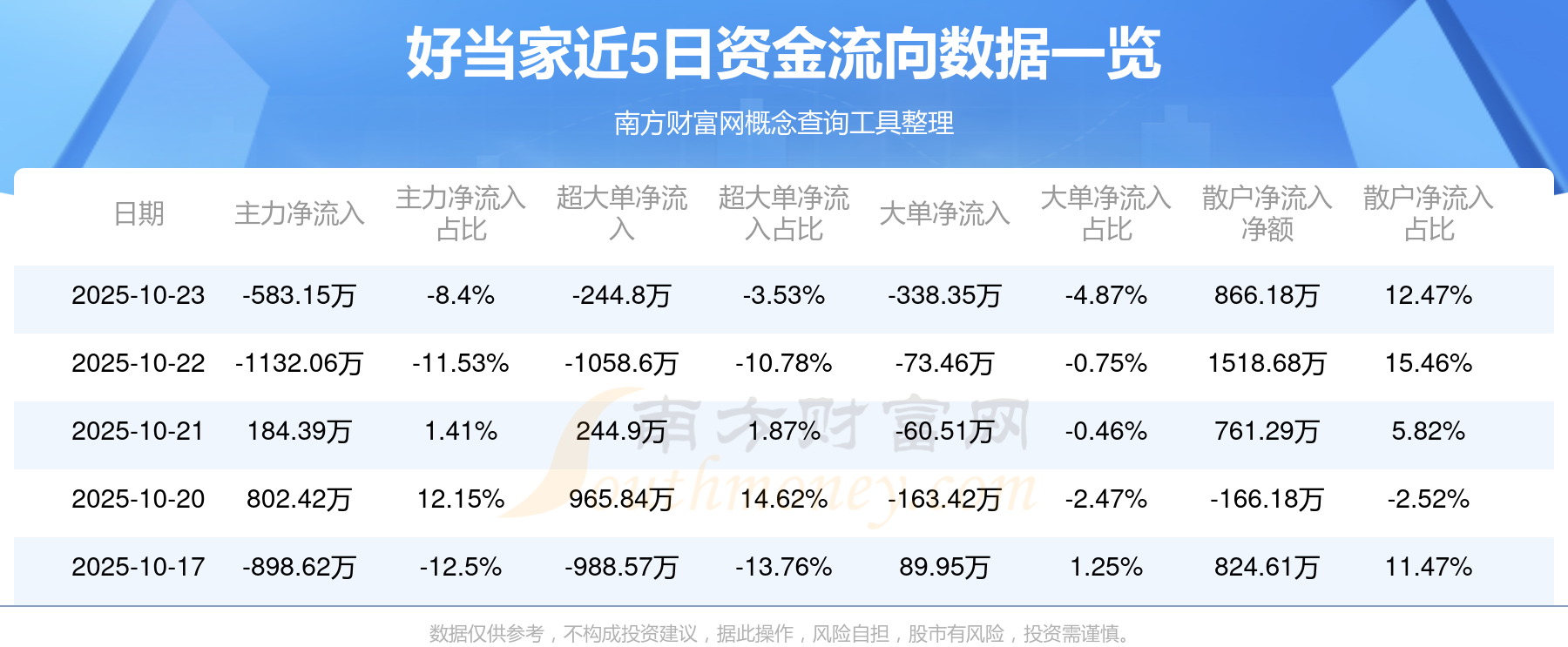 10月23日消息,好當(dāng)家10月23日主力資金凈流出583.15萬元,超大單資金凈流出244.8萬元,大單資金凈流出338.35萬元,散戶資金凈流入866.18萬元。