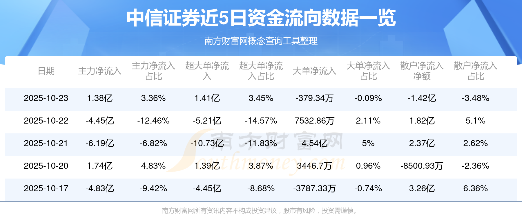 10月23日消息,中信證券10月23日主力資金凈流入1.38億元,超大單資金凈流入1.41億元,大單資金凈流出379.34萬元,散戶資金凈流出1.42億元。