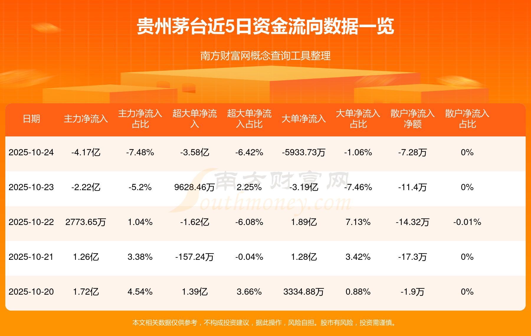 10月24日消息,貴州茅臺資金凈流出4.17億元,超大單凈流出3.58億元,換手率0.3%,成交金額55.13億元。