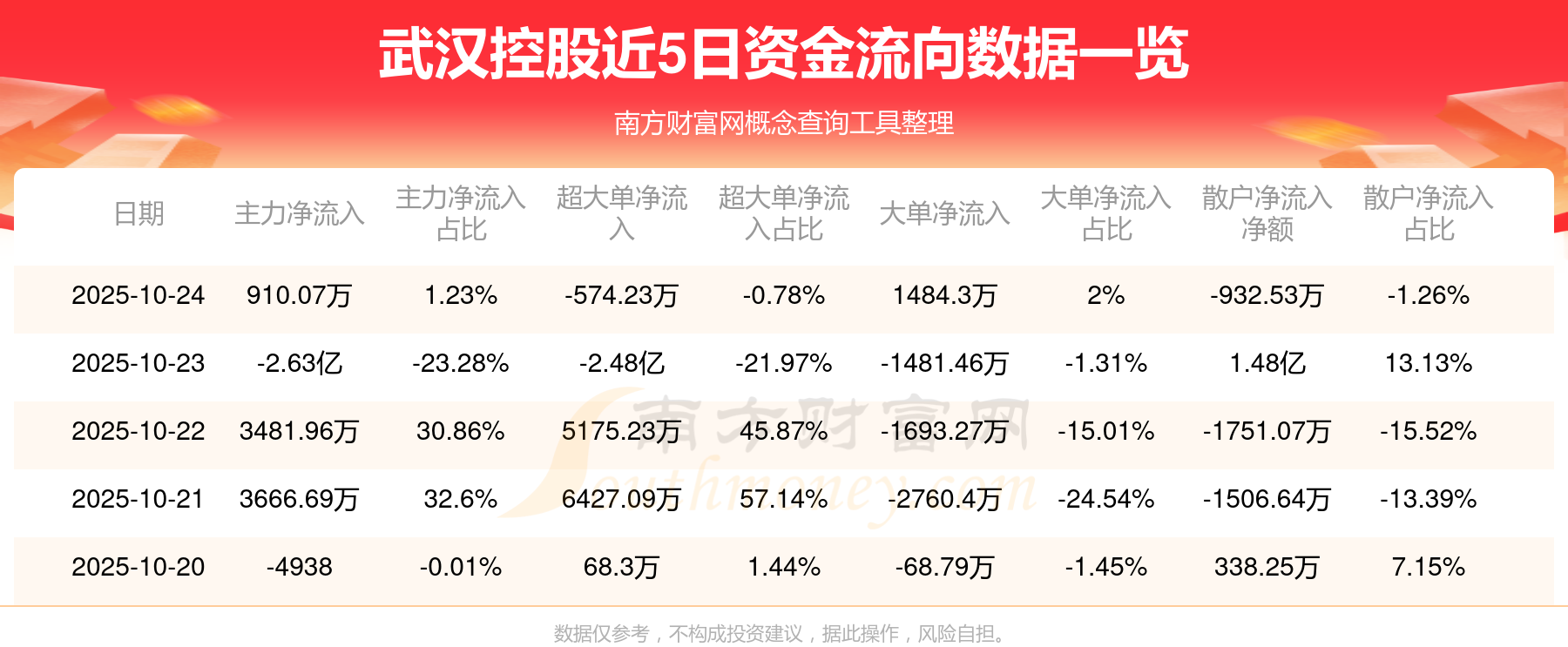 10月24日消息,武漢控股10月24日主力凈流入910.07萬元,超大單凈流出574.23萬元,大單凈流入1484.3萬元,散戶凈流出932.53萬元。