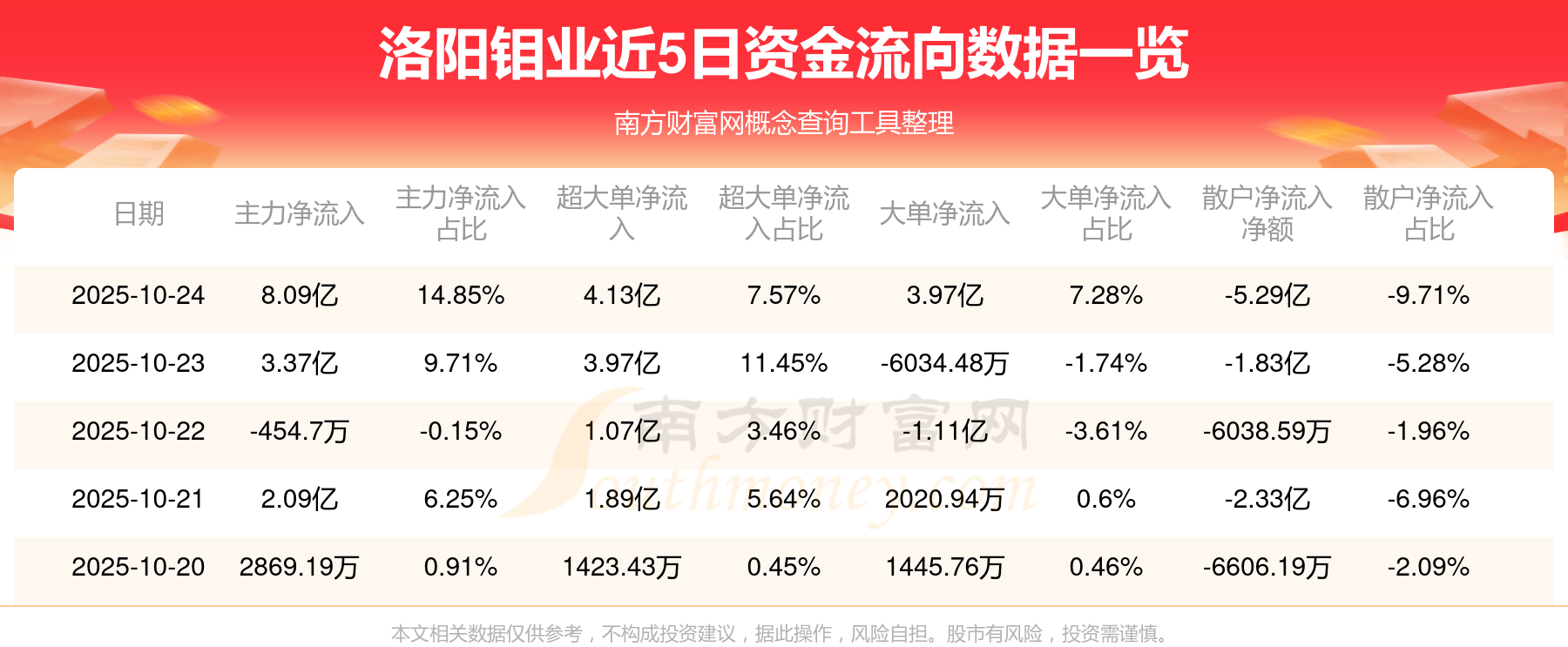 10月24日消息,洛陽鉬業(yè)資金凈流入8.09億元,超大單資金凈流入4.13億元,換手率1.89%,成交金額54.5億元。