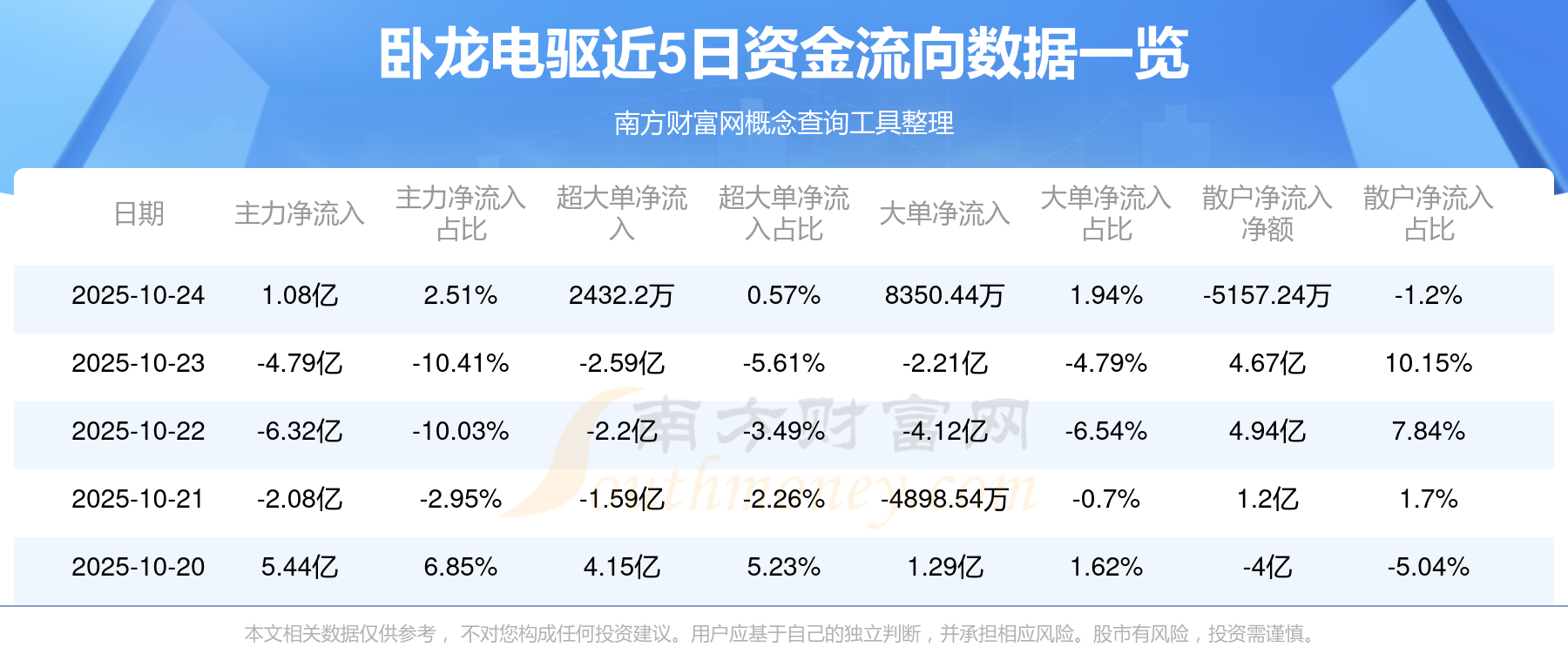 10月24日該股主力資金凈流入1.08億元,超大單資金凈流入2432.2萬元,大單資金凈流入8350.44萬元,中單資金凈流出5625.4萬元,散戶資金凈流出5157.24萬元。