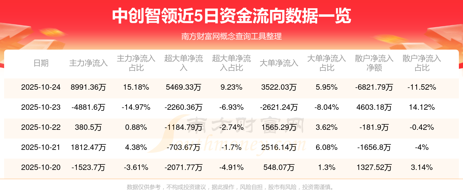 10月24日消息,中創(chuàng)智領(lǐng)主力凈流入8991.36萬元,超大單凈流入5469.33萬元,散戶凈流出6821.79萬元。