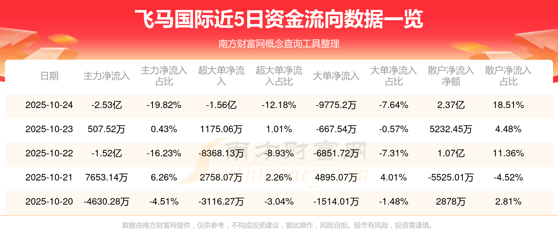 10月24日消息,飛馬國際資金凈流出2.53億元,超大單資金凈流出1.56億元,換手率12.45%,成交金額12.79億元。