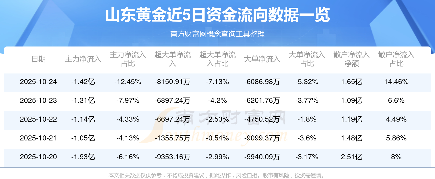 10月24日消息,山東黃金10月24日主力資金凈流出1.42億元,超大單資金凈流出8150.91萬元,大單資金凈流出6086.98萬元,散戶資金凈流入1.65億元。