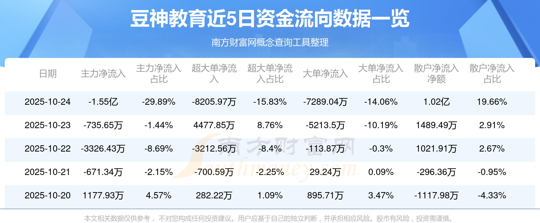10月24日消息,豆神教育資金凈流出1.55億元,超大單資金凈流出8205.97萬元,換手率4.39%,成交金額5.18億元。