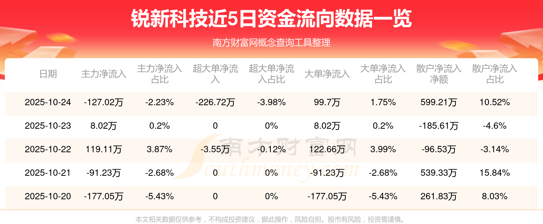 根據(jù)數(shù)據(jù)顯示,銳新科技股票在10月23日15點漲0.68%,報價為16.500元。當日成交額達到5694.86萬元,換手率2.75%,總市值為27.46億元。