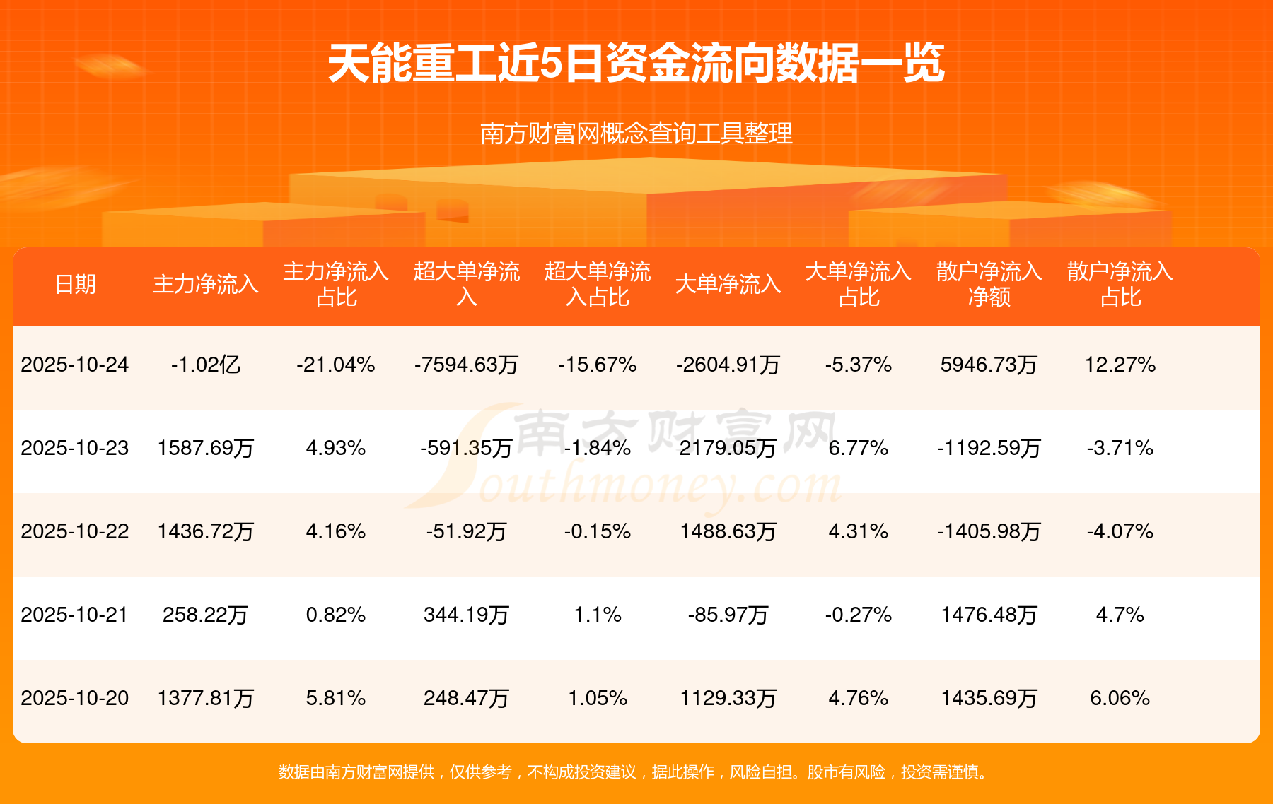 10月24日消息,天能重工資金凈流出1.02億元,超大單凈流出7594.63萬(wàn)元,換手率7.09%,成交金額4.85億元。